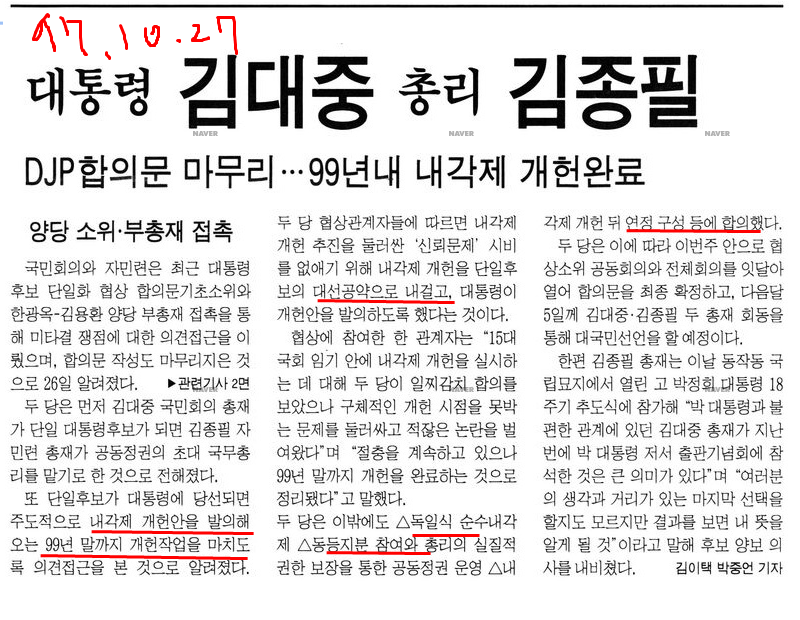 [메모 2] 1997년 대선 승리 이후, 김대중과 김종필의 내각제로 개헌 약속은 파기됨.