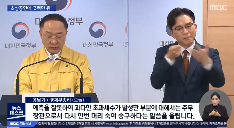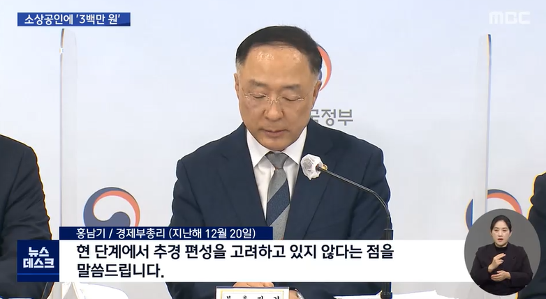 "정부는 소상공인·자영업자 여러분들을 보다 두텁게 지원해 드리기 위해서 작년에 발생한 초과세수 등 가용한 재원을 최대한 활용해서, 추가경정예산안을 편성하기로 결정했습니다."