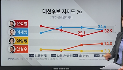 윤석열 32.9%, 이재명 34.6%, 안철수 14% , 심상정 3%