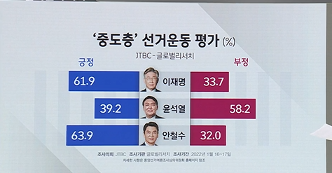 특히 중도층에서의 평가도 윤 후보가 39.2%로, 이재명, 안철수 두 후보에 비해 20%p 넘게 쳐지는 상황입니다.