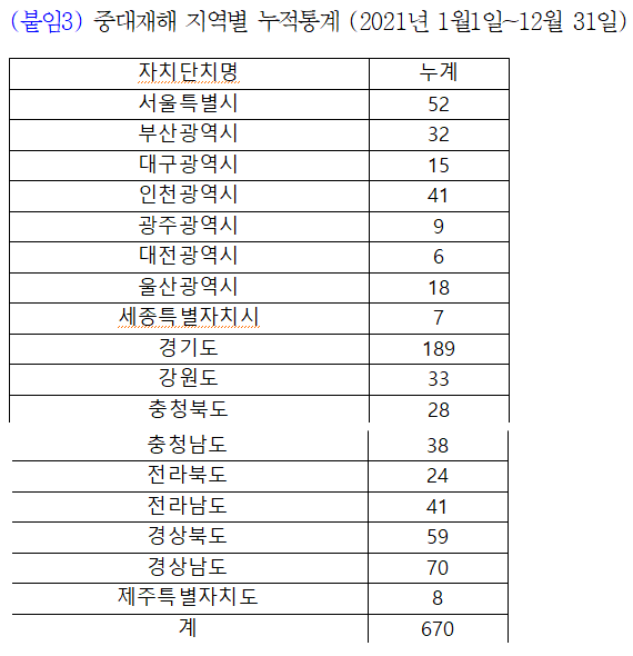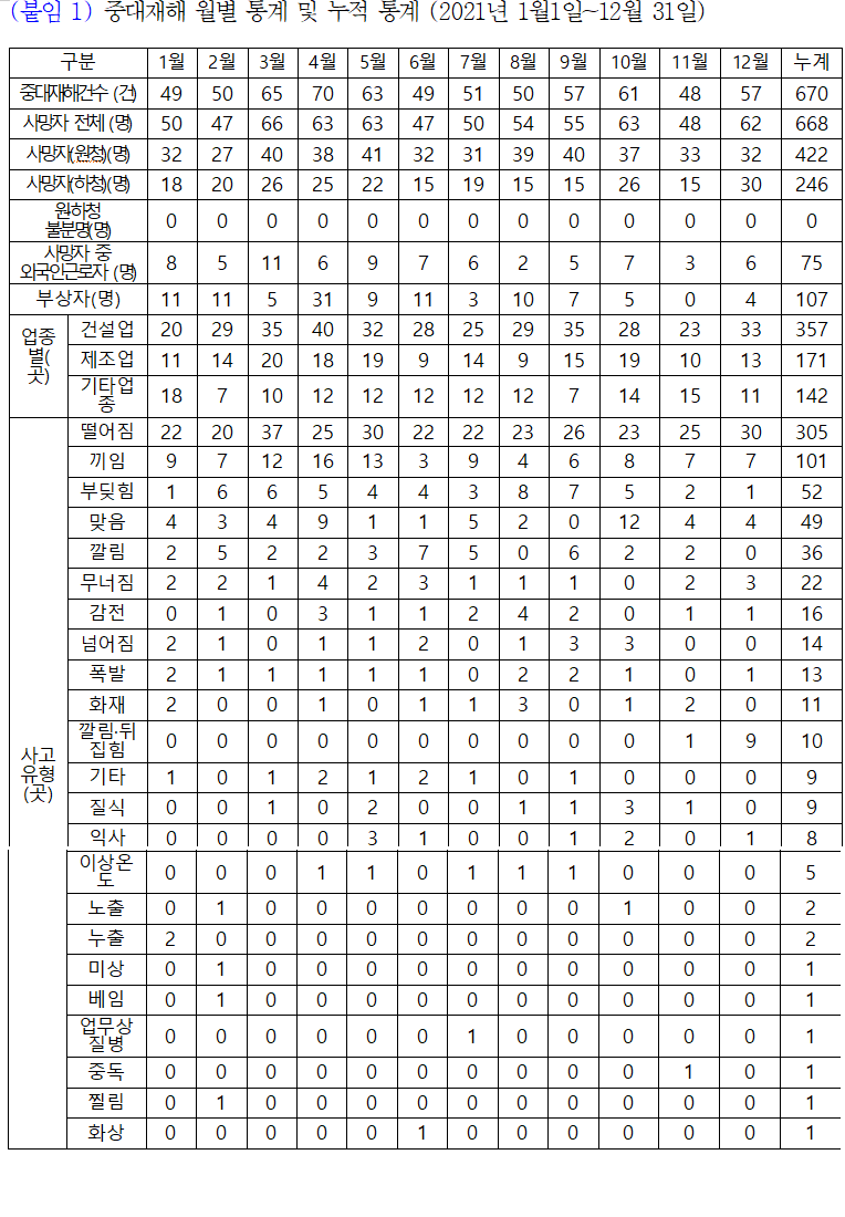 2021년 1월~12월 중대재해 누적건수 670건, 사망 668명