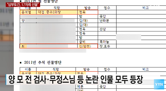 2003년에는 광주지검 부임을 축하하는 난을 보냈고, 기록이 없는 2005년과 2006년을 제외하고는 2015년까지 매년 명절 선물을 보낸 것으로 나와 있습니다.