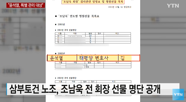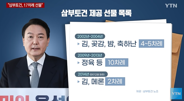 윤석열 국민의힘 대선 후보가 삼부토건 조남욱 회장으로부터 17차례나 선물을 받았다는 의혹이 제기됐습니다.