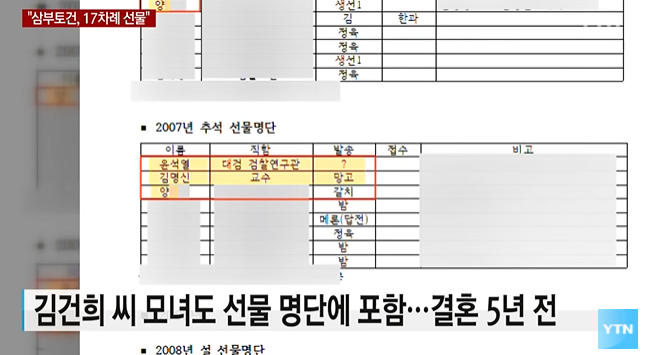 김 씨의 모친 최 모 씨도 선물 명단에 두 차례 이름을 올렸습니다.