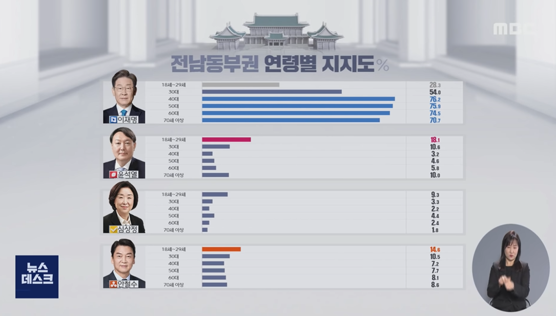 18~29세. 이재명 28.3, 윤석열 18.1, 심상정 9.3, 안철수 14.6.
