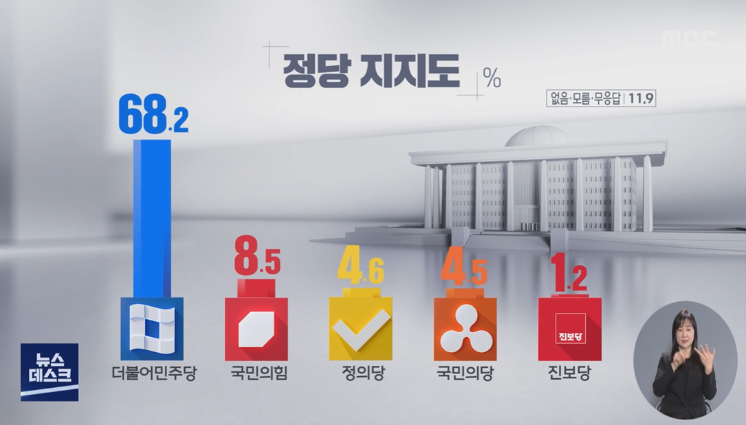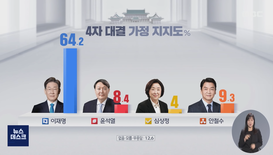 1. 4자 대결 가정. 민주당 이재명 64.2, 국민의힘 윤석열 8.4, 정의당 심상정 4, 국민의당 안철수 9.3