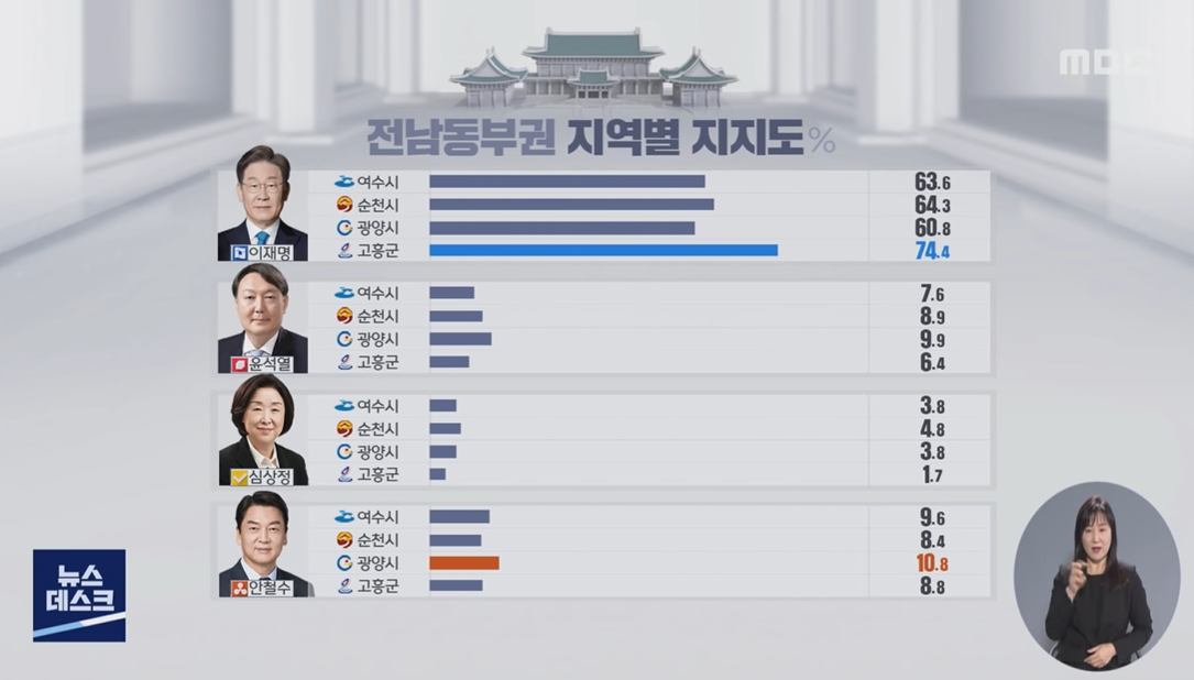 심상정 순천 4.8, 여수 3.8, 광양 3.8, 고흥 1.7
