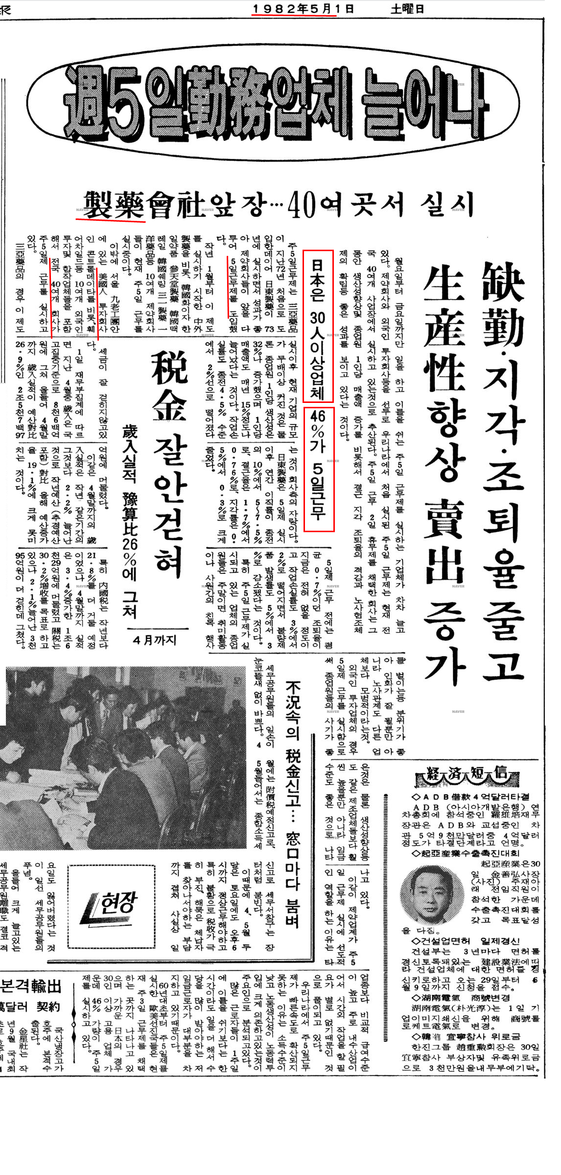 3) 외국 사례 보도. 일본의 30인 이상 기업, 46%가 주 5일 근무한다고 소개.
