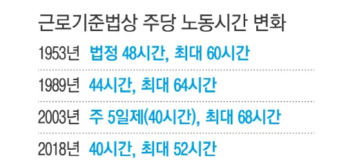 1989년 근로기준법이 개정되면서 주당 근로시간은 44시간, 주당 최대 근로시간은 64시간으로 바뀌었다.