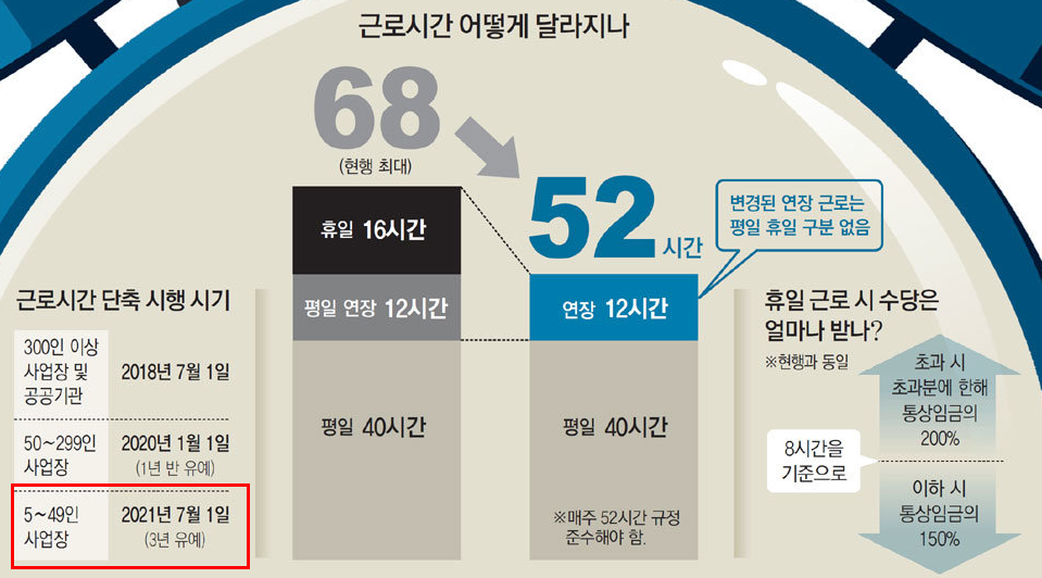 300인 이상 대기업은 올 7월부터 시행되며 중소기업이 근로시간 단축에 대비할 수 있도록 근로자 50∼299명인 사업장은 2020년 1월부터, 5∼49명인 사업장은 2021년 7월부터 각각 적용된다. 30인 미만 사업장은 2022년 12월 31일까지 한시적으로 특별 연장근로 8시간이 허용돼 주당 60시간 근로가 가능하다.