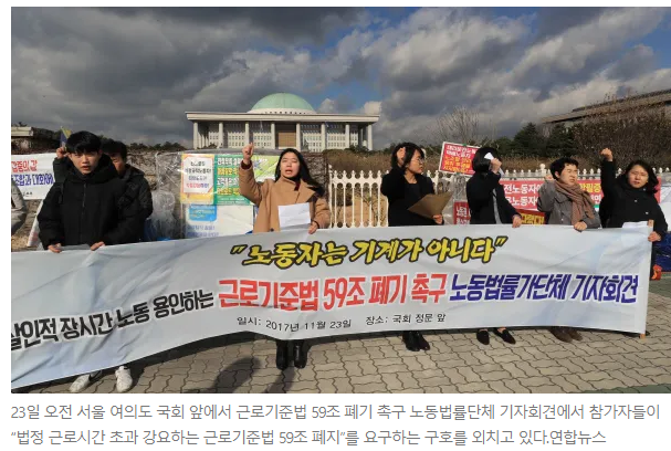 23일 오전 서울 여의도 국회 앞에서 근로기준법 59조 폐기 촉구 노동법률단체 기자회견에서 참가자들이 “법정 근로시간 초과 강요하는 근로기준법 59조 폐지”를 요구하는 구호를 외치고 있다.연합뉴스
