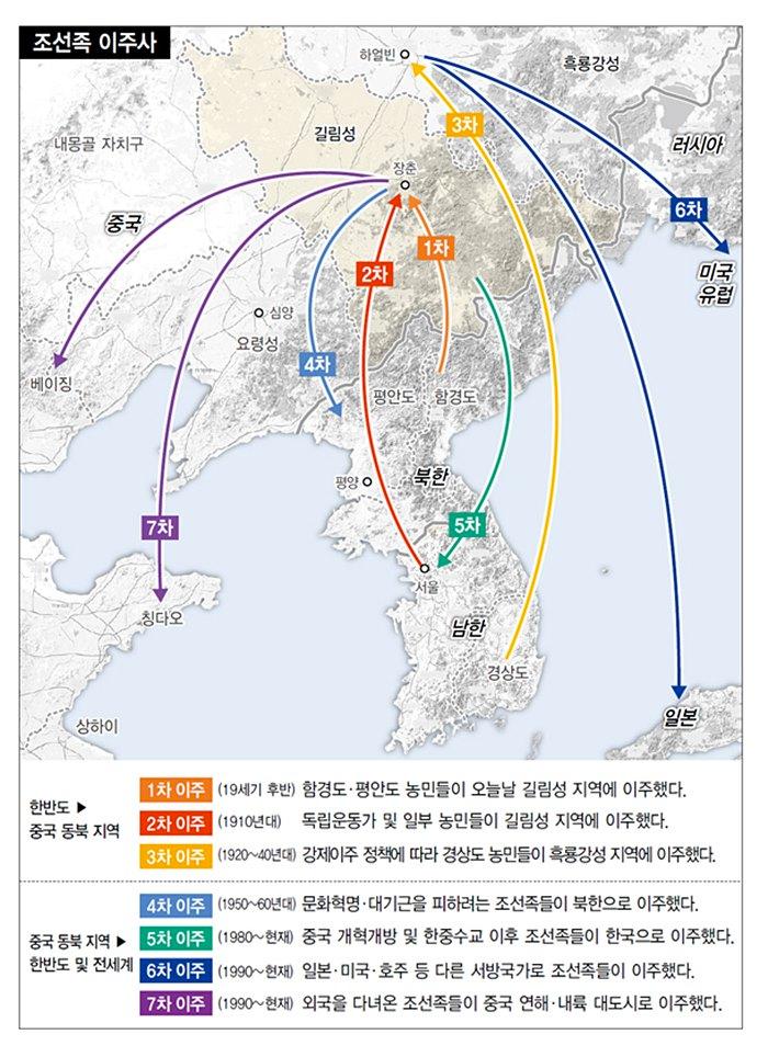 초기 이주는 기근을 피해 두만강을 넘어 오신 분들이고, 1905년 을사늑약 이후 독립운동 혹은 경제적 이유 등 다양한 이유로 오신 분들입니다. 3차는 일제의 만주사변 이후, 만주국 (지금의 동북삼성)을 집어 삼키고 여기 농사를 위해 일제가 강제로 경상도 등 남도분들을 흑룡강쪽으로 이주 시킨 분들 입니다.
