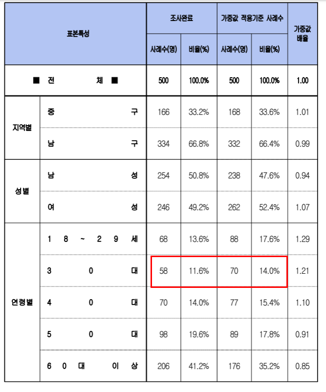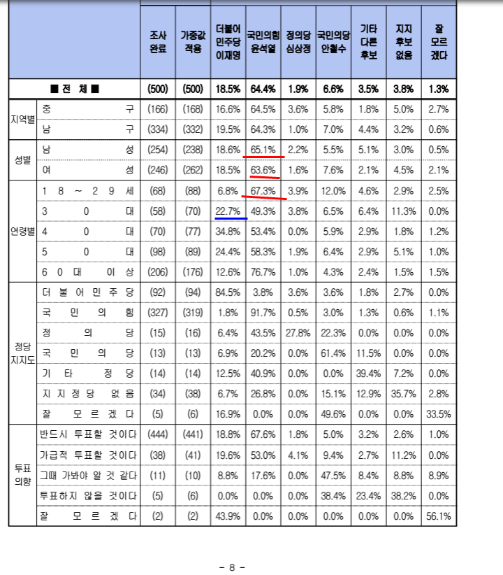 대구-중구-남구: 윤석열(국힘) 64.4%, 이재명 (민주) 18.5%, 심상정 (정의) 1.9%, 안철수(국민) 6.6%