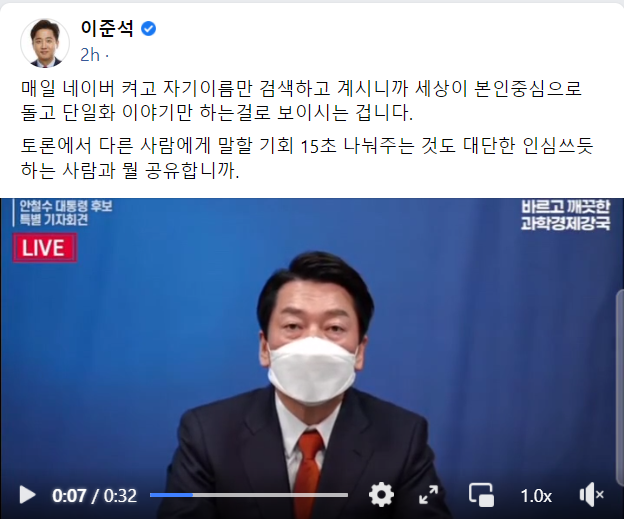 매일 네이버 켜고 자기이름만 검색하고 계시니까 세상이 본인중심으로 돌고 단일화 이야기만 하는걸로 보이시는 겁니다. 토론에서 다른 사람에게 말할 기회 15초 나눠주는 것도 대단한 인심쓰듯 하는 사람과 뭘 공유합니까.