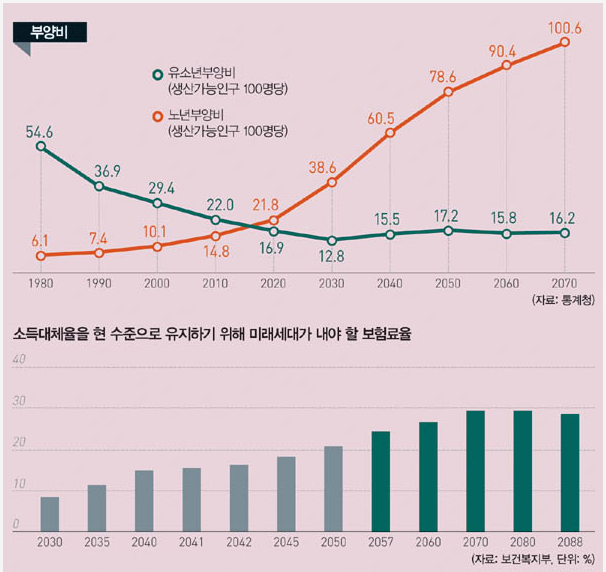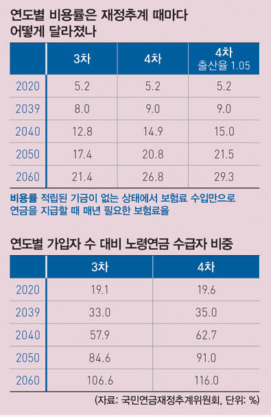 한국의 보험료율은 독일(18.6%), 미국(12.4%), 일본(18.3%)에 비해서도 크게 낮다. 4차 재정계산에 따르면 현 수준의 소득대체율을 유지하려면 미래세대가 내야 할 보험료율은 적자로 돌아서는 2041년 15.6%, 기금이 소진되는 2057년 24.6%로 상승한다. 재정계산 최종연도인 2088년엔 28.8%까지 치솟는다. 받을 사람은 느는데 낼 사람은 줄어드는 사회의 필연적 귀결이다.