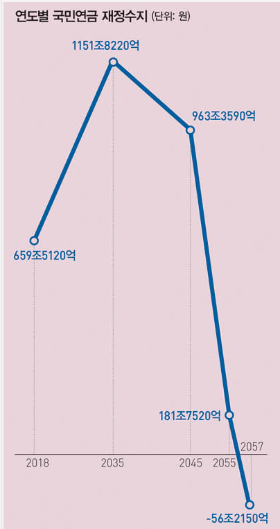 국민연금의 현재 좌표는 ‘국민연금은 2042년 적자를 내기 시작해 2057년 기금이 고갈될 것으로 전망된다.’