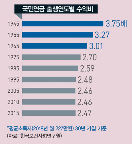 이와 맞물려 국민연금의 수익비(가입자가 가입 기간 납부한 보험료 총액의 현재가치 대비 생애 기간 받게 되는 연금급여 총액의 현재가치)도 주목할 필요가 있다. 이는 달리 말하면 낸 것 대비 받는 것의 비율인데 국민연금에 빨리 가입한 세대일수록 더 높게 추산된다. 한국보건사회연구원에 따르면 2018년 기준 월 227만원을 받는 평균소득자가 30년 동안 국민연금을 납부했을 때 수익비는 1945년생은 3.75배, 1975년생은 2.7배, 2015년생은 2.47배로 나타났다. 김원식 건국대 경제통상학과 교수는 “(수익비가 1배 넘는다는 건) 누군가 대신 부담하고 있다는 얘기다. 현재 최고소득을 받는 가입자의 수익비도 1보다 높게 나온다. 소득이 높건 낮건 국민연금 수급자들이 모두 다음 세대에 부담을 넘기고 있다는 뜻”이라며 “수익비가 1배에 근접하도록 조정해야 한다”고 밝혔다.