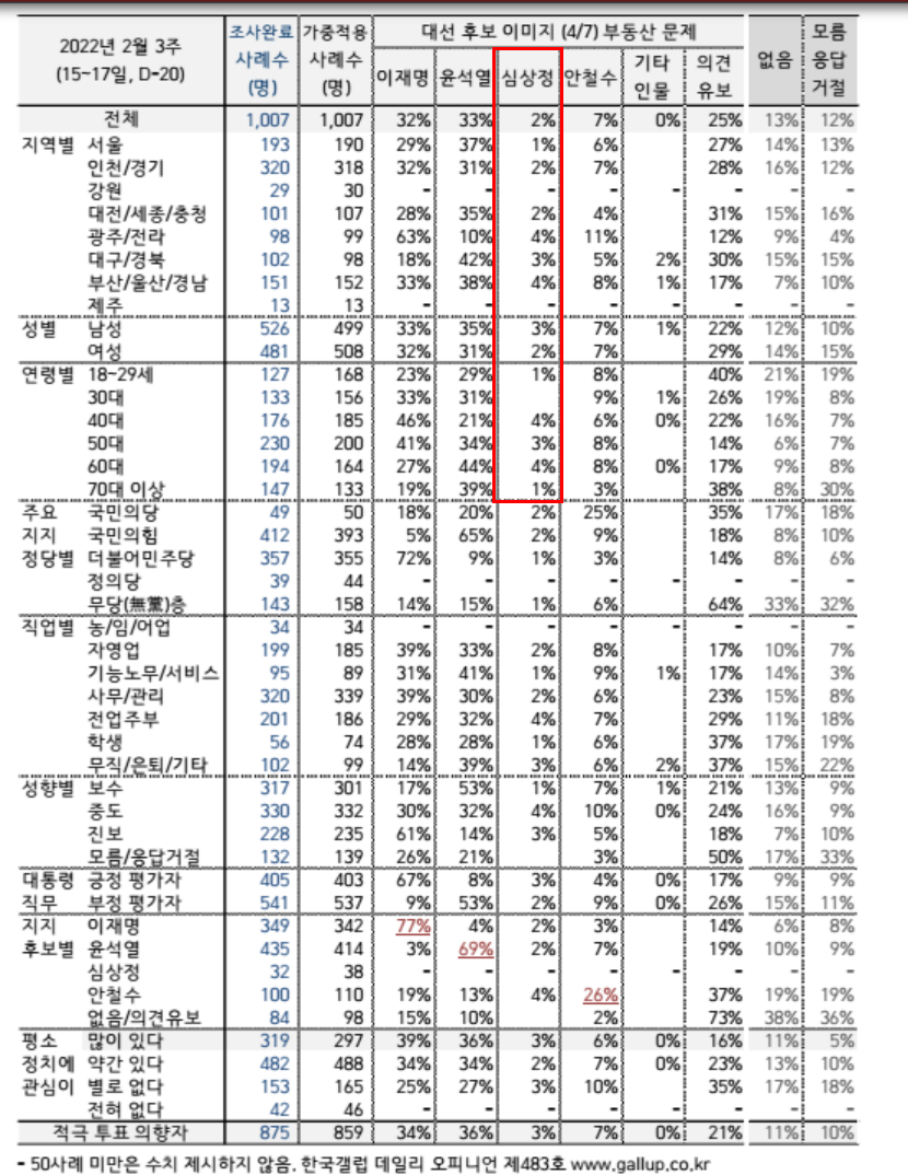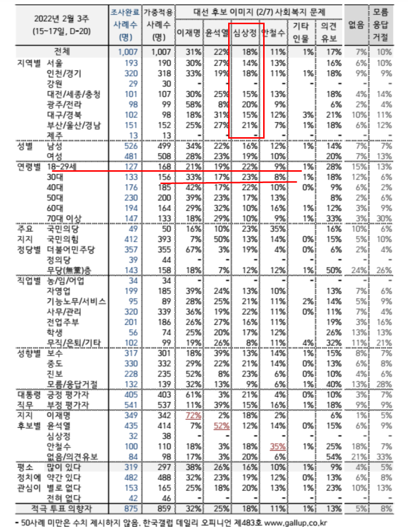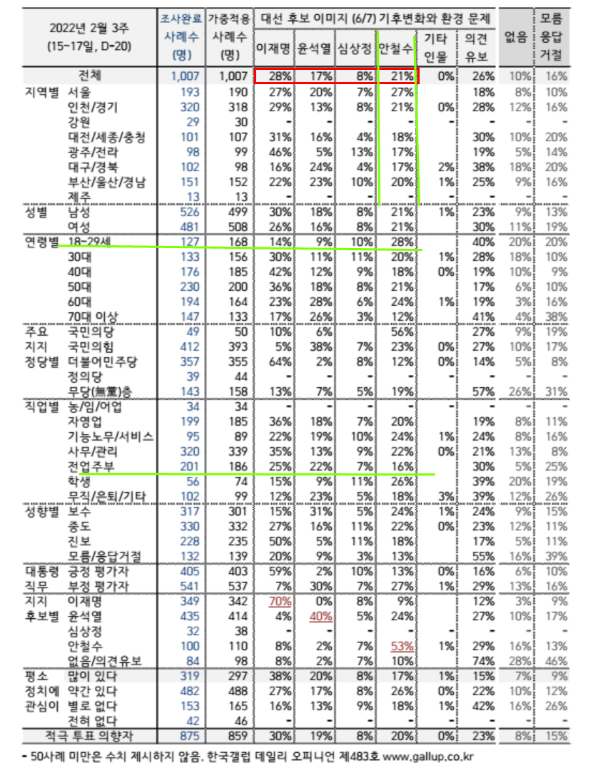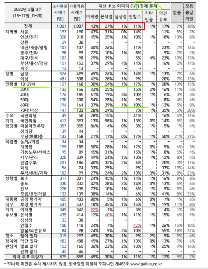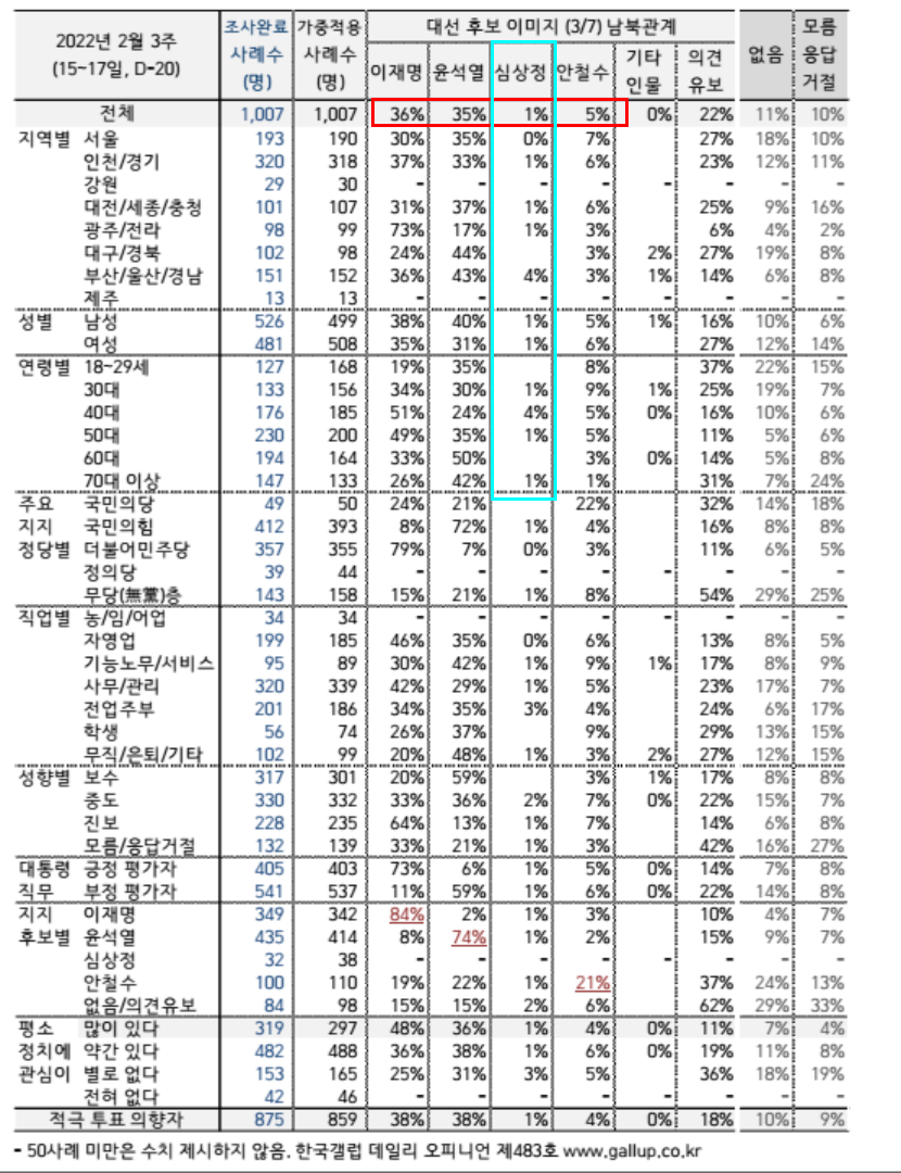 안철수가 서울 경기에서 17%라는 게 특징적이다. 이것은 이재명과 윤석열에 비해 가족 검증에서 자유롭기 때문이고, 안철수 지지층이 '안철수의 안정감'을 높이 샀기 때문이다.