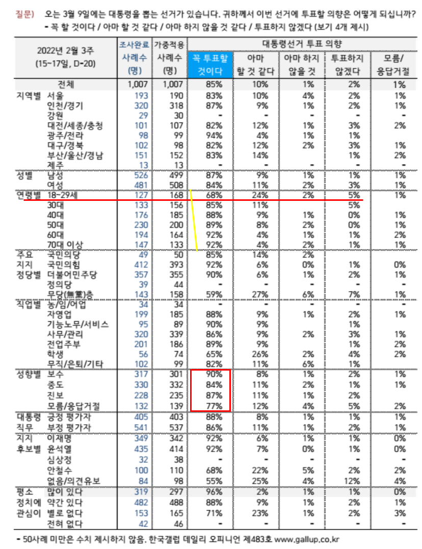 기존의 갤럽조사들과 17일 결과를 대조하면서 발견한 점은, 응답자 정치성향이다. 윤이 이를 7% 앞선 것으로 나왔으나, 갤럽 여론조사 응답자의 정치성향 분포를 고려할 때, 1위와 2위는 2~3% 차이 안팎으로 보여진다. 2월 17일 조사에서 윤석열이 7% 정도 앞섰고, 2월 10일 조사에서는 1% 정도 앞섰다. 보수층 응답자 표본이 진보층에 비해 8.8%가 많았다는 것도 고려해야 한다.