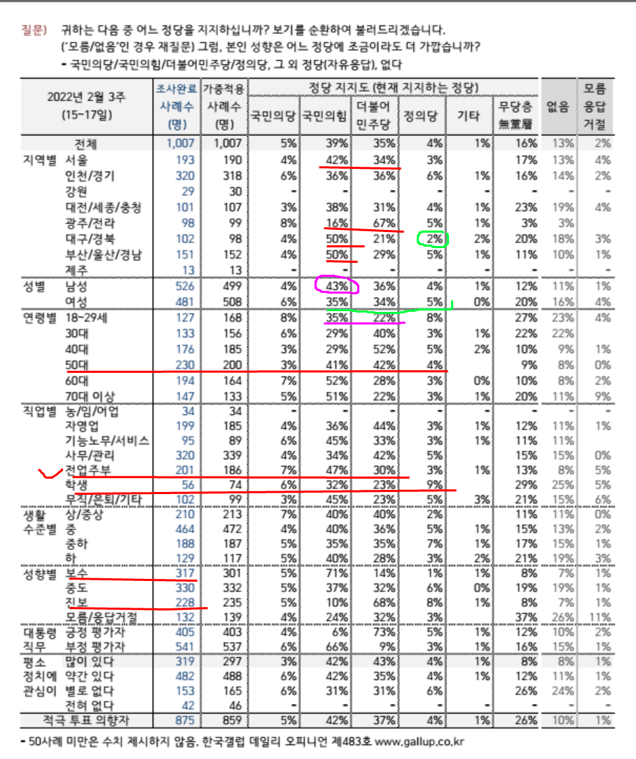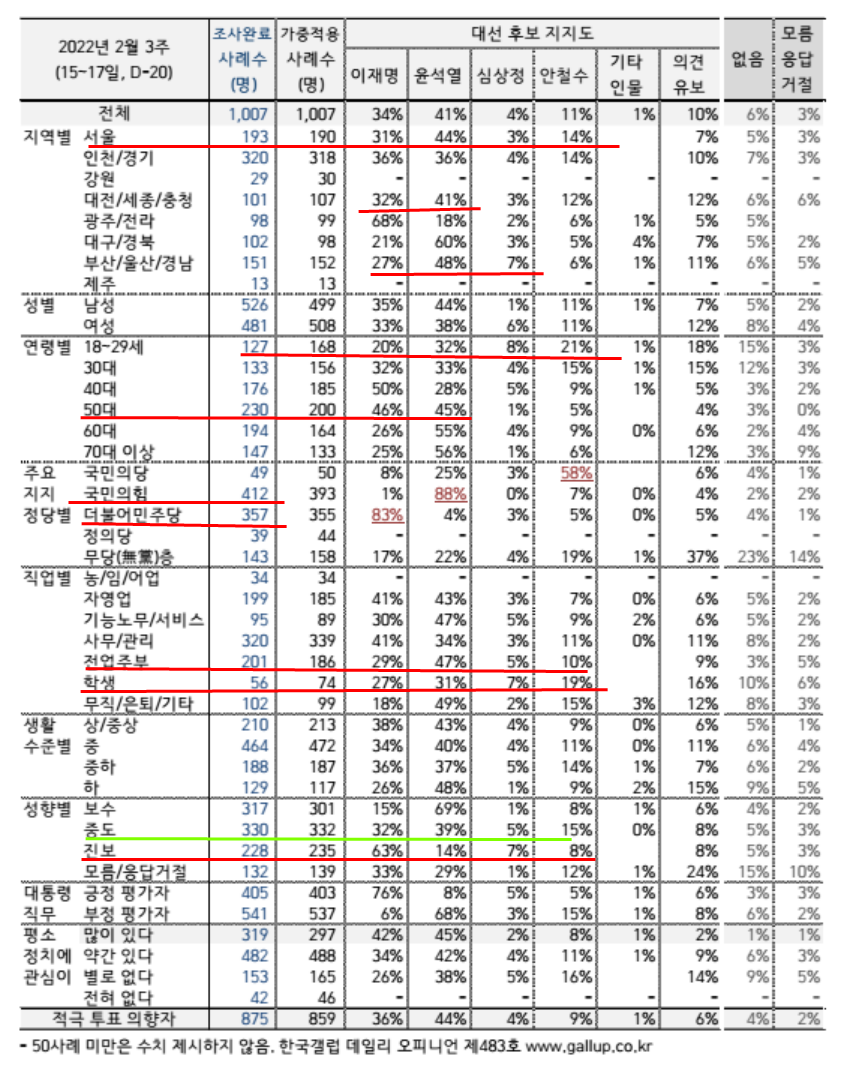 보수층(317명), 중도층(330명),진보층(228명), 지향 밝히지 않음(132명)이다. 보수층 31.5%, 중도층 32.8%, 진보층 22.6%, 모름 13.1%이다. 보수층 응답자가 진보층에 비해 8.8%가 더 많다.민주당 이재명 34%, 국힘 윤석열 41%, 정의당 심상정 4%, 국민의당 안철수 11%.