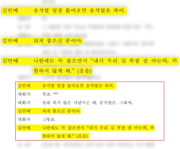 우상호 민주당 선거대책위원회 총괄본부장은 이날 서울 여의도 당사에서 기자간담회를 열고 김씨와 정영학 회계사가 나눈 통화 녹취록을 공개했다. 녹취록에서 김씨는 정씨에게 “윤석열 영장 들어오면 윤석열은 죽어”라고 말했고, 정씨는 “죽죠. 원래 죄가 많은 사람이긴 해. 윤석열은”이라고 맞장구친다. 이어 김씨는 “(윤 후보가) 되게 좋으신 분이야. 나한테도 꼭 잡으면서 ‘내가 우리 김(만배) 부장 잘 아는데, 위험하지 않게 해’(라고 했다)”라고 말한다.