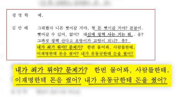 우 본부장은 김씨가 이재명 더불어민주당 대선 후보에게 돈을 준 적이 없다는 취지로 말한 통화 내역도 공개했다. 녹취록에서 김씨는 “내가 죄가 뭐야? 문제가? 한번 물어봐. 사람들한테. 이재명한테 돈을 줬어? 내가 유동규한테 돈을 줬어?”라고 말한다. 우 본부장은 “김만배가 ‘내가 이재명한테 돈을 줬냐’고 항변한 것은 이재명 후보가 대장동 사업에서 아무 이득을 취한 것이 없다는 사실이 드러난 것”이라고 했다.