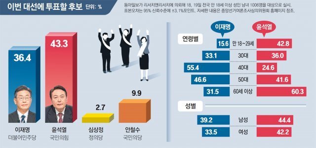 동아일보가 리서치앤리서치에 의뢰해 18, 19일 이틀간 전국 성인 남녀 1006명을 대상으로 실시한 여론조사 결과 이번 대선 최대 승부처로 꼽히는 서울과 인천·경기에서 윤 후보가 모두 40%를 넘기며 이 후보와의 지지율 차이를 2주 전보다 벌렸다.