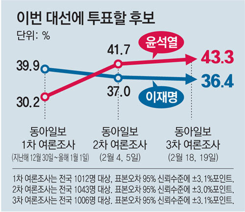 동아일보가 4, 5일 실시한 2차 여론조사 결과와 비교해 이 후보 지지율은 0.6%포인트 내려갔고 윤 후보의 지지율은 1.6%포인트 올랐다.