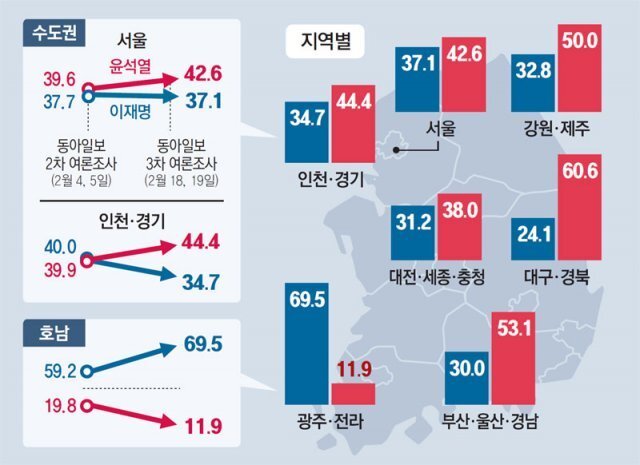 尹, 수도권 지지율 차 벌리고… 李, 호남서 격차 키워