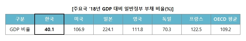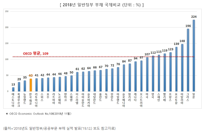 2017년 기준 경제협력개발기구(OECD)의 국내총생산(GDP) 대비 일반정부 부채비율은 평균 110.5%이며 우리나라는 40.1%로 32개국 중 4번째로 낮은 수준이다.