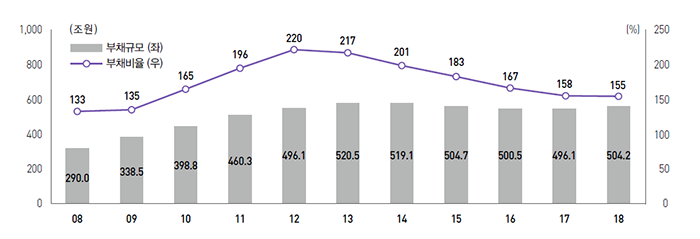 공공기관의 부채규모는 2013년 520.5조원 → 2018년 504.2조원 수준으로 안정세이다. 부채비율(부채/자본)은 6년 연속 하락하고 있다. 국내총생산(GDP) 대비 공공기관 부채*도 2009년 이후 최저 수준이다.
