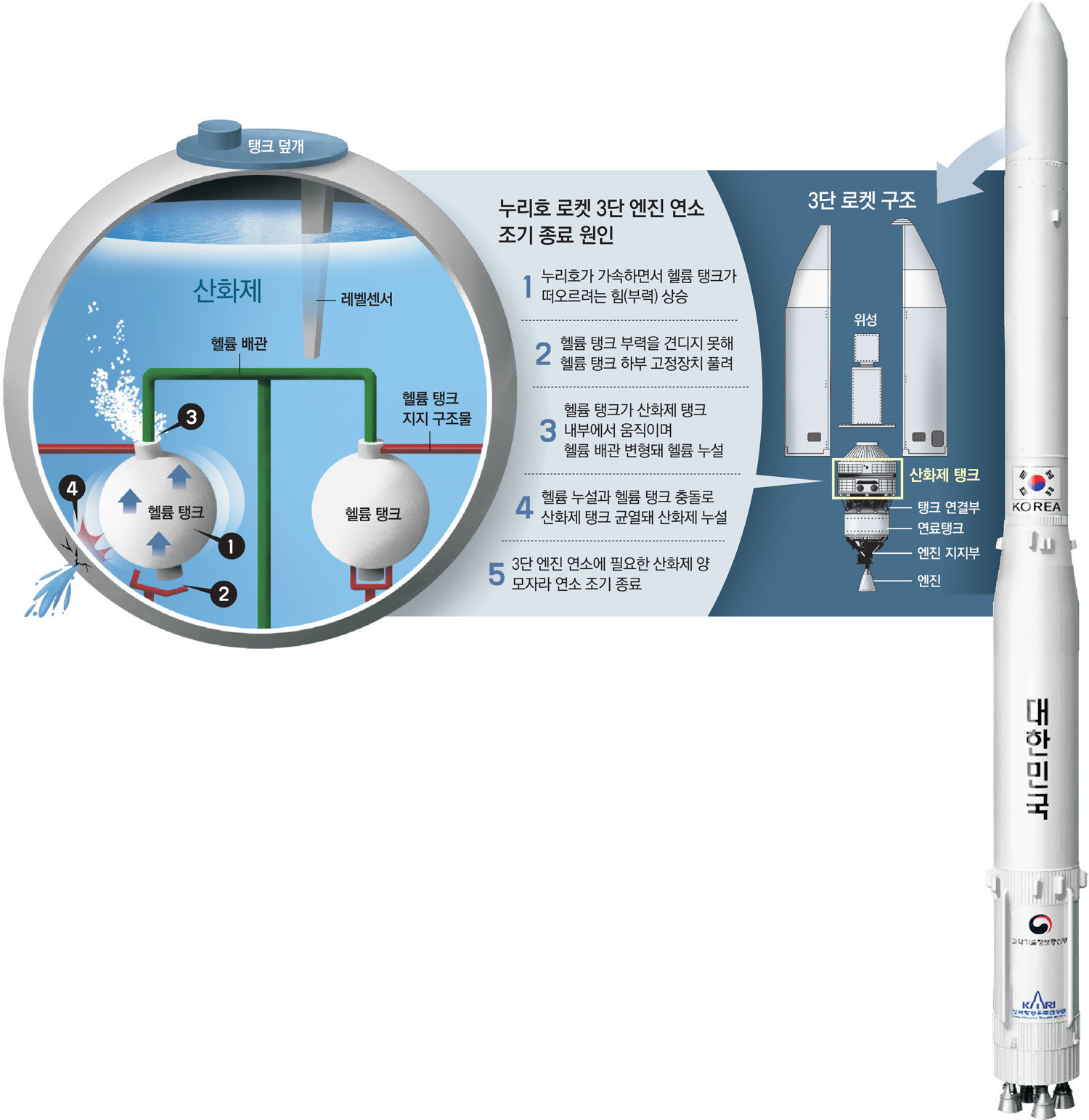 조사위에 따르면 누리호 첫 발사 당시 산화제 탱크에 설치된 헬륨 탱크 3개 중 1개가 고정장치에서 빠지면서 탱크 내부에 부딪쳐 헬륨 탱크에 균열이 발생한 것으로 밝혀졌다. 곧이어 산화제가 누출되면서 3단 엔진에 유입되는 산화제 양이 줄어 연소가 조기에 종료됐을 것이라는 설명이다.