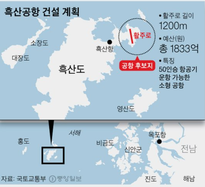 총 1833억 원을 들여 흑산도 북동쪽 끝 지역인 예리 일대에 1200m 길이의 활주로를 만드는 게 골자다.