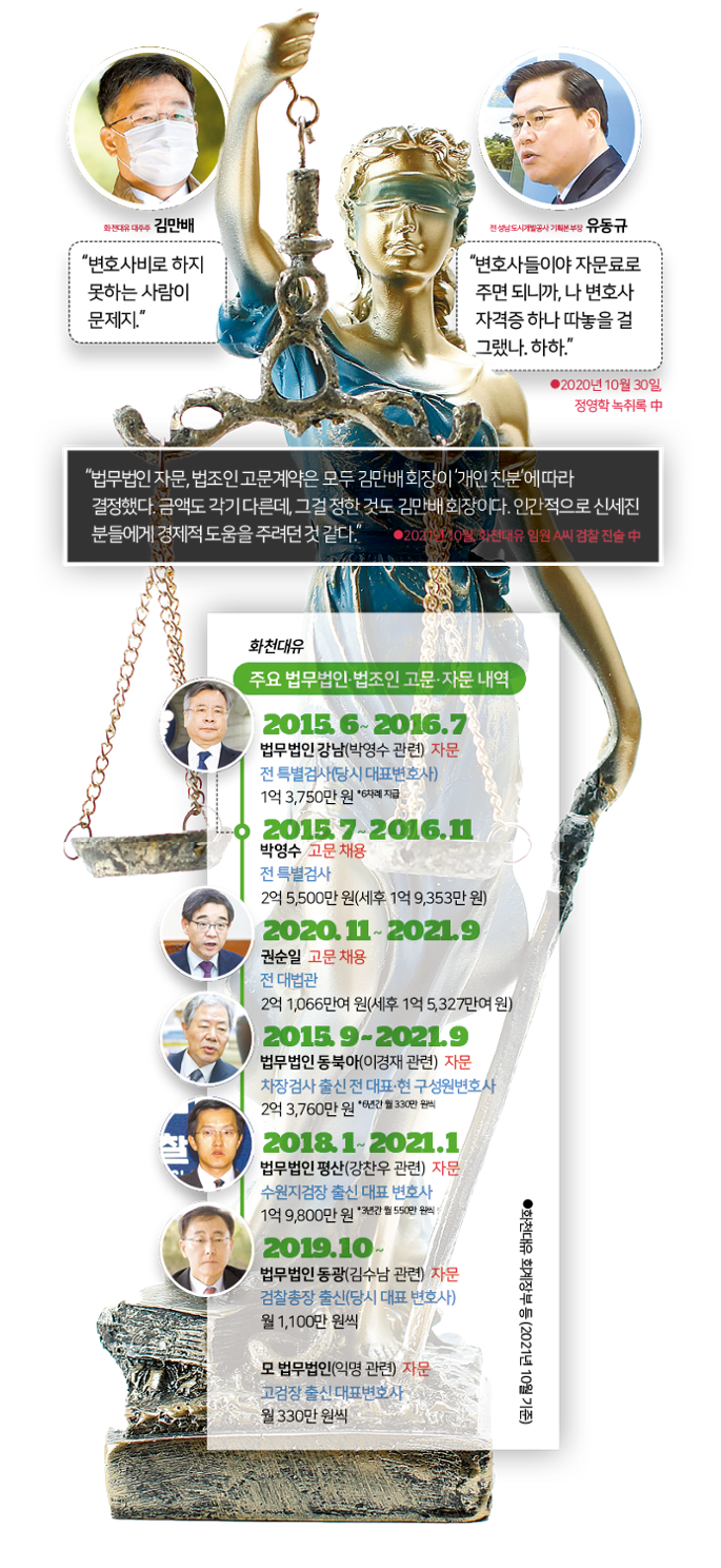 화천대유는 호화 고문단과 자문단에 매달 수억 원을 전달하며 각별히 신경 쓰는 모습을 보였다. 한국일보가 입수한 '정영학 녹취록'에선 "변호사들이야 자문료를 주면 된다. 변호사 자격증을 따 놓을 걸 그랬다. 변호사비로 처리하지 못하는 사람이 문제"라는 이야기가 나온다. 고문 변호사에 대한 왜곡된 인식이 드러나는 대목이다.