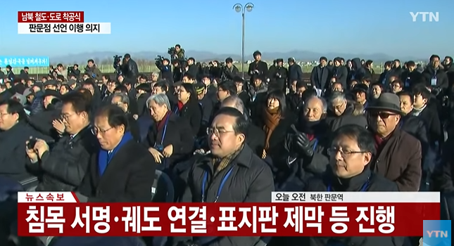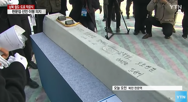 남북이 각각 착공사를 하고난 뒤에, 철로를 지지하는 침목에 서명을 하는 행사를 진행합니다.