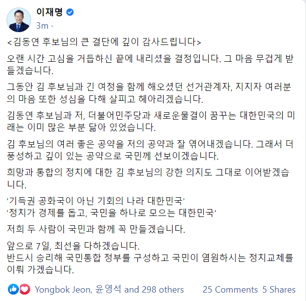 김 후보님의 여러 좋은 공약을 저의 공약과 잘 엮어내겠습니다. 그래서 더 풍성하고 깊이 있는 공약으로 국민께 선보이겠습니다.