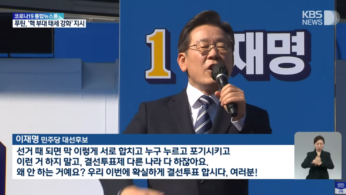 안철수-윤석열과의 합당 선언 이후, 민주당 이재명 후보가 할 일은, 아래 선언대로 그대로 하면 된다. "선거 때 되면 막 이렇게 서로 합치고 누구 누르고 포기시키고 이런 거 하지 말고, 결선투표제 다른 나라 다 하잖아요? 왜 안하는 거예요? 우리 이번에 확실히 결선투표합시다. 여러분" (이재명 민주당 후보 연설)