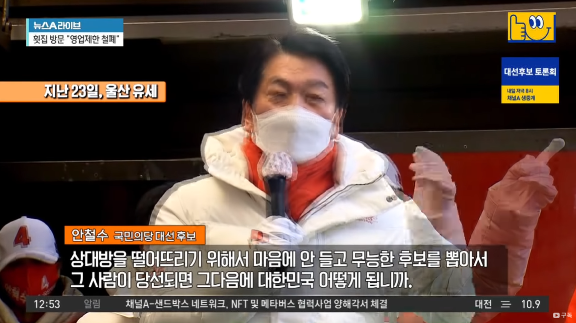 이 영상을 보면, 안 후보는 지난 22일 울산 중앙시장 유세에서 윤 후보를 겨냥해 “주술에 씌인 듯 정권교체를 하면 다 좋아질 것이라고 생각하는 분들이 많다. 하지만 그렇지 않다”면서 “대통령감은 세상이 어떻게 바뀌고 어떤 방향으로 가는지 아는 사람이어야 한다”고 했다.