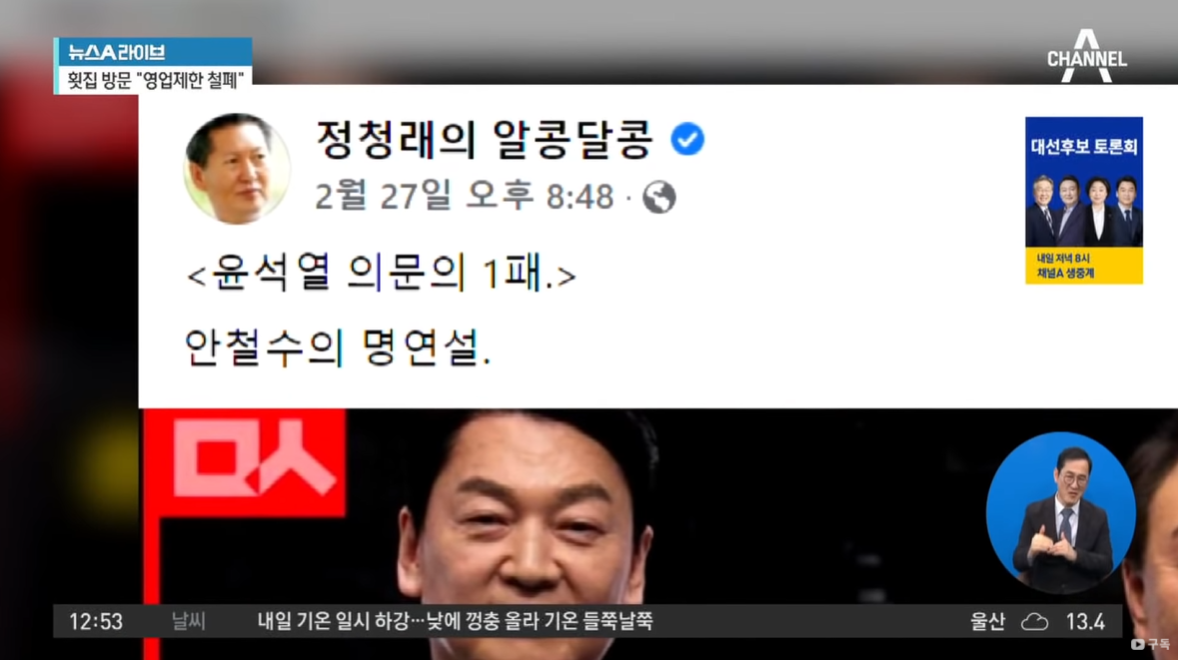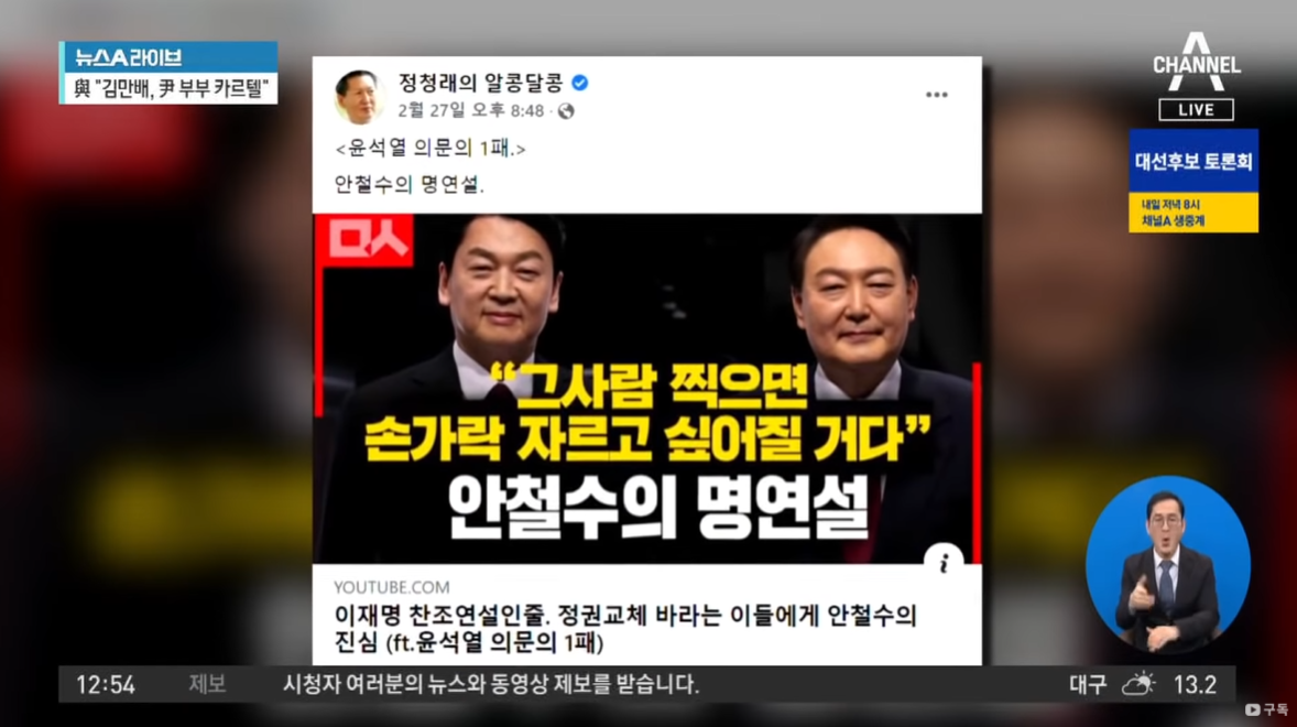 정 의원은 이날 페이스북에 안 후보의 발언이 담긴 영상을 올리고, “윤석열 의문의 1패. 안철수의 명연설”이라고 썼다. 이 영상은 민중의소리가 촬영 제작해 유튜브 채널에 올린 것이다. 영상 제목은 ‘이재명 찬조연설인줄. 정권교체를 바라는 이들에게 안철수의 진심(ft.윤석열 의문의1패)’이다.