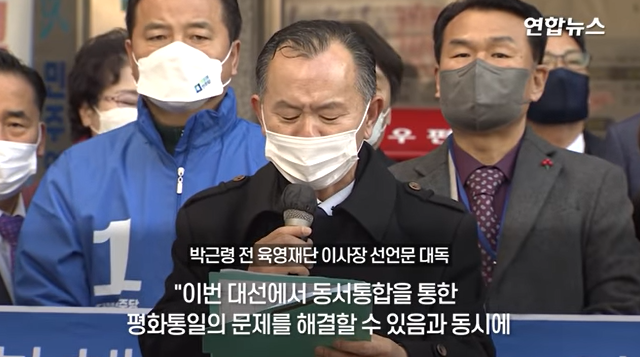 박 전 이사장 측은 이날 여의도 민주당 당사 앞에서 기자회견을 열고 "이번 대선에서 동서 통합을 통한 평화통일의 문제를 해결할 수 있음과 동시에 '영호남통합권력'을 창출할 수 있는 유일한 후보는 단연코 이 후보라고 확신한다"는 내용을 담은 박 전 이사장의 지지선언문을 대독했다.