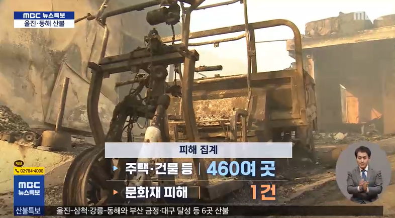 지금까지 인명피해는 없지만, 울진과 강릉 등지에서 주택과 건물 등 460여 곳이 모두 불에 탔고, 강원 동해 '어달산 봉수대' 등 문화재 피해가 1건 집계됐습니다.