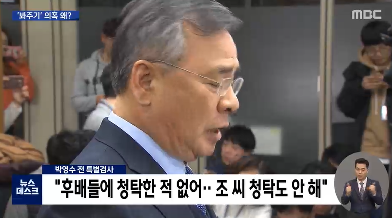 박영수 전 특검 측은 오늘 "변호사 활동을 하면서 후배검사들에게 수임 사건을 청탁한 사실이 단 한 번도 없고, 조 씨 사건을 검찰에 청탁할 이유도 없다"고 밝혔습니다.