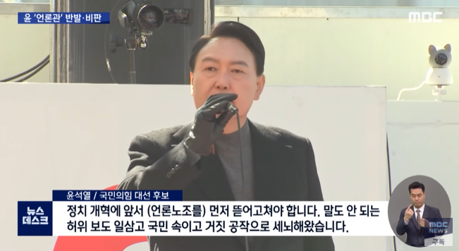 언론 노조는 "허위 사실이자 언론에 대한 노골적인 협박"이라면서 강하게 반발했고, 정치권에서도 "망언을 넘어선 폭언"이라면서, 윤 후보의 언론관에 대한 비판이 잇따랐습니다.