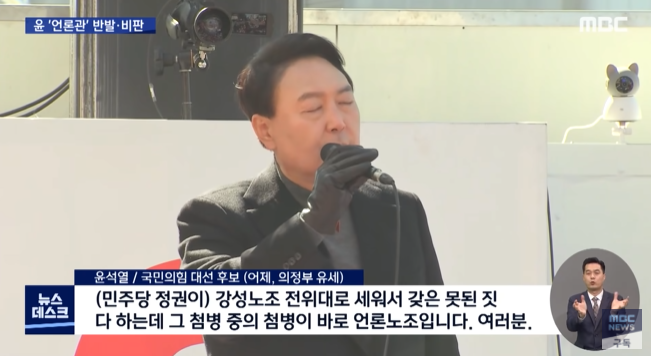 국민의힘 윤석열 후보가 전국 125개 언론사 언론인들이 가입해 있는 언론노조를, '민주당 전위대'라고 몰아세우면서, "뜯어 고치겠다"고 말해서 논란이 되고 있습니다.