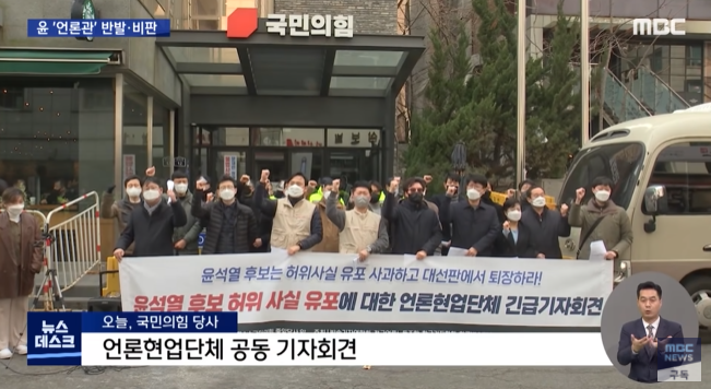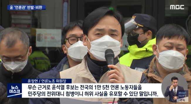 "무슨 근거로 윤석열 후보는 전국의 1만 5천 언론 노동자들을 민주당의 전위대니 첨병이니 허위 사실을 유포할 수 있단 말입니까."