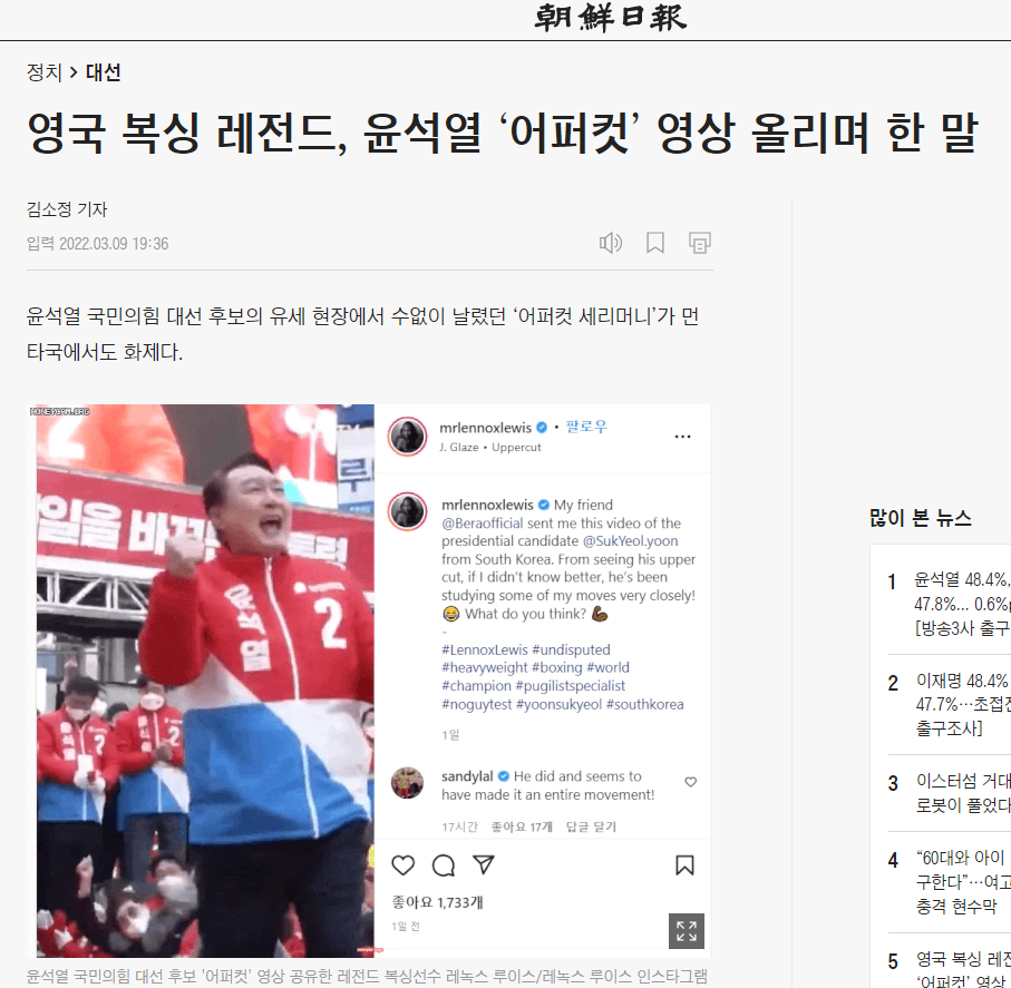 레전드 복서 레녹스 루이스(57)는 8일(한국 시각) 인스타그램에 지인이 보내줬다며, 윤 후보의 어퍼컷 영상을 올렸다. 이 영상에는 지난달 15일 부산 유세 현장에서 윤 후보가 지지자들을 향해 어퍼컷 세리머니를 하는 모습이 담겼다. 이어 선수 시절 상대 선수에게 어퍼컷을 날리는 루이스의 모습도 나온다.