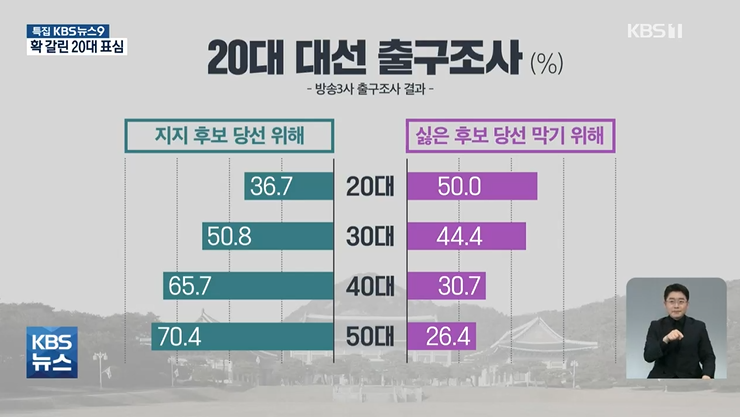 출구조사 결과를 심층분석해 보면 전 연령대에서 유일하게 20대만 싫어하는 후보가 당선되는 것을 막기 위해서 투표했다는 비율이 더 높았습니다.