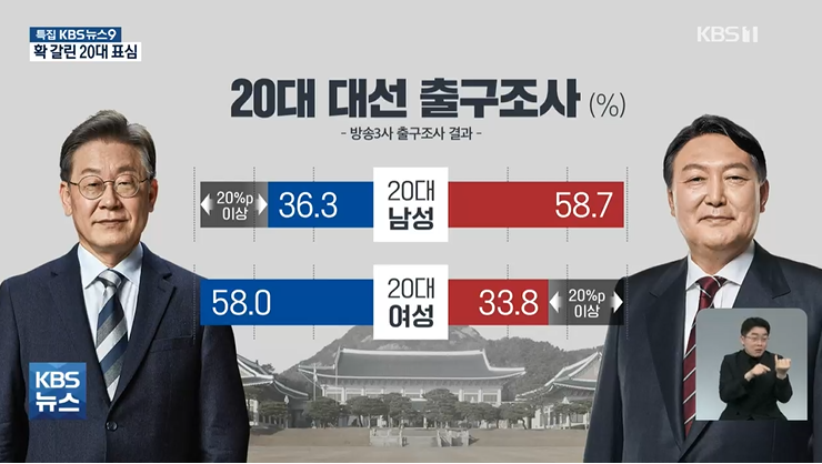 (역대 최초 결과. 20대 남성 윤석열 지지 58.7% 이재명 36.3%. 20대 여성 이재명 지지 58%, 윤석열 지지 33.8% 정 반대 결과.)