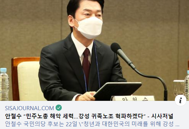안철수가 노골적으로 노동조합에 대한 적대감을 표현했다. 신세계 정용진과 윤석열의 '멸공' '멸치' 공격과 궤를 같이 한다. 안철수가 왜 '기술혁신을 통한 자본주의 성장' 주장, 자신의 보수적인 중도층을 넘어서는 발언을 일삼기 시작했는가?