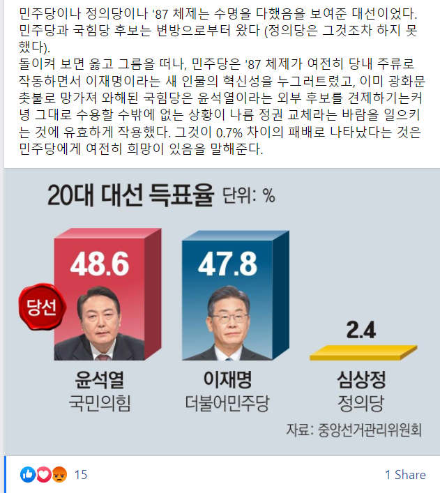 민주당이나 정의당이나 '87 체제는 수명을 다했음을 보여준 대선이었다.